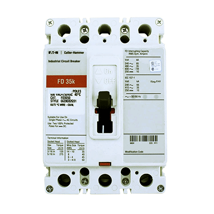 The FD series FD35K Catalog Number EHD3060 is a molded case circuit breaker rated at 60A and the voltage is 480V AC. It also has a DC voltage rating of 250V. This breaker is 3-pole. The AIC rating for this breaker is 35,000, at 480V AC. The Cutler Hammer FD circuit breaker Frame is a top-of-the-line product that offers superb protection and performance. This breaker is designed to handle heavy duty applications and provides consistent, reliable operation. With its robust construction and durability, the FD is perfect for use in industrial and commercial settings. It features a unique interrupter system that allows it to shut off power quickly and effectively in the event of an overload or short circuit. Additionally, the FD has a thermal-magnetic trip unit that helps protect against damaging electrical surges.